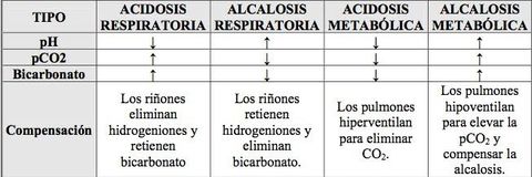 Alcalosis Respiratoria -Aumento del pH -Disminución del Co2 -Hiperventilación--> Estimulación del centro respiratorio, hipoxia, cambios SNC, trastornos psíquicos | Compensación renal de la alcalosis --> Aumento de la excreción de HCO3 y disminución de su producción Diagnóstico hiperventilación permanente o periódica, pH >7,45, pCO2 baja HCO3− normal o disminuido. Alcalosis respiratoria compensada pH es normal pCO2 baja concentración de HCO3− disminuida. |