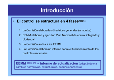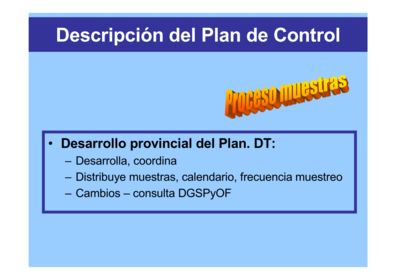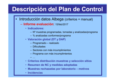 | Descripción del plan de control NATURALEZA | CONTROL DOCUMENTAL Fase F/E/O TOMA DE MUESTRAS Garantía legal: Reglamentario /Prospectivo Información previa: Sospechosos/aleatorios, dirigidos |