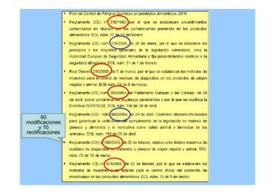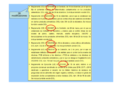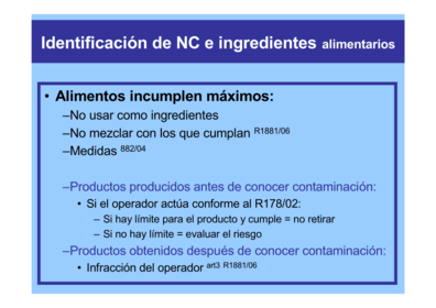 | Identificación de no conformidades e ingredientes alimentarios | Reglamento 1881/06: Los alimentos que incumplen los contenidos máximos establecidos no se pueden utilizar como ingredientes, ni ser mezclados con los que cumplan y hay que adoptar las medidas contempladas en el Reglamento 882/2004. |