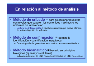 | Métodos bioanalíticos | los basados en principios biológicos como los ensayos celulares. Dan una indicación del nivel de EQT (equivalentes tóxicos) expresado en equivalentes bioanalíticos (EQB). |