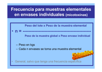| Frecuencia para muestras elementales en envases individuales (micotoxinas) (frecuencia de muestreo (n) para lotes comercializados en envases individuales) |