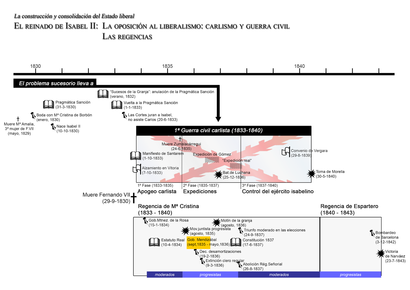 | 12.1. El reinado de Isabel II. La oposición al liberalismo [incluyendo cuestión sucesoria]: carlismo y guerra civil. La cuestión foral. 12.2. Isabel II (1833-1843): las Regencias. |