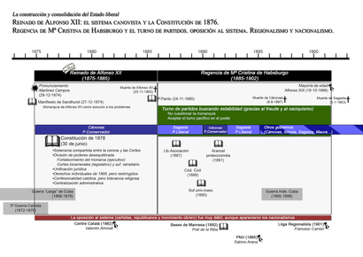 | 12.5. Reinado de Alfonso XII: el sistema canovista y la Constitución de 1876. 12.6. La Regencia de María Cristina de Habsburgo y el turno de partidos. La oposición al sistema. Regionalismo y nacionalismo. | |