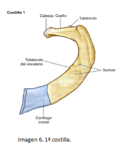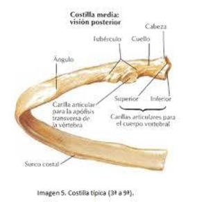 | costillas típicas | de la 3a asta 9a costilla ////cuello,2carrilas articulares,cuerpo y tubérculo //em el cuerpo :angulo y surco(para nervios y vasos) |
