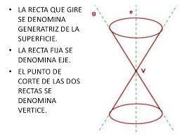 | la superficie de la cónica se genera al girar un a recta generatriz alrededor de otra fija llamada eje, ala que corta un punto v. | |