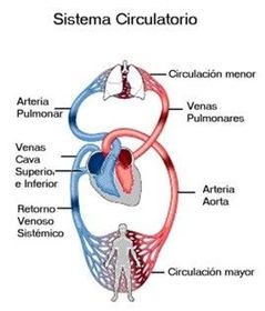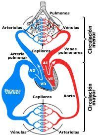 | Circulación Menor | Es el recorrido que efectúa la sangre carboxigenada que sale del ventrículo derecho del corazón y que, por la arteria pulmonar. Esta sangre oxigenada regresa por las venas pulmonares a la aurícula izquierda del corazón. |