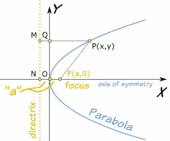 | parabola | Es la seccion conica de exentricidad resultante de cortar un cono recto con un plano cuyo angulo de inclinacion respecto al eje de revolucion del cono sea igual presentado por su generatriz |
