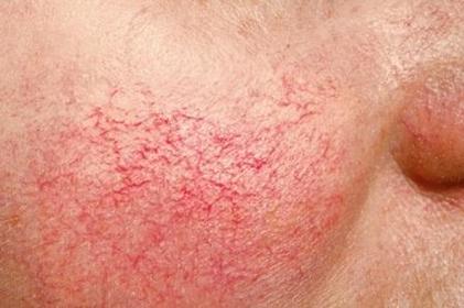 | Telangiectasias Dilatacion de los capilares superficiales de la piel que producen lesiones rojizas en forma de araña | |