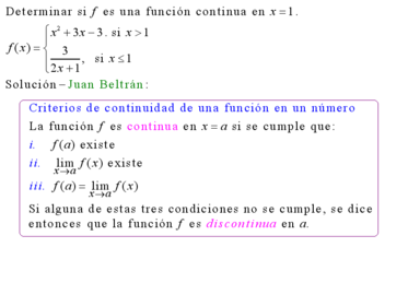 Continuidad | Una funcion f es continua en un número a si se satisfacen a las tres condiciones. |