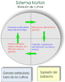 SISTEMA NORFOLK | Es un sistema de cultivo, que se basa en la rotación cuatrienal, combinando las plantas forrajeras, los cereales, los nabos y la cebada. |