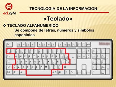 El teclado alfanumérico | es similar al teclado de una máquina de escribir, dispone de todas las letras del alfabeto, los diez dígitos decimales y todos los signos de puntuación y acentuación, además de la barra espaciadora. |