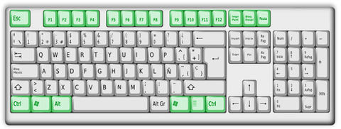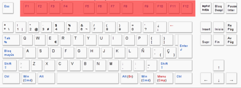 Las teclas de función | se sitúan el la parte superior del teclado alfanumérico, van del F1 al F12, y son teclas que aportan atajos en el uso del sistema informático. Por ejemplo, al pulsar F1 se suele activar la Ayuda del programa que se está usando. Algunos teclados modernos incluyen otro conjunto de teclas en la parte superior a las de función que permiten acceder a Internet, abrir el correo electrónico o controlar la reproducción de archivos multimedia. Estas teclas no tienen un carácter universal y dependen de cada fabricante, pero también se pueden considerar teclas de función. |