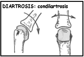 CONDILA Articulación condiloidea (cóndilo) o articulación elipsoidea (elipsoide). En anatomía, dícese de la diartrosis que se forma entre la superficie convexa de un hueso y la superficie cóncava de otra, por ejemplo, la articulación radiocarpiana de al muñeca. Permite el movimiento libre en dos planos y un poco de circunducción. | |