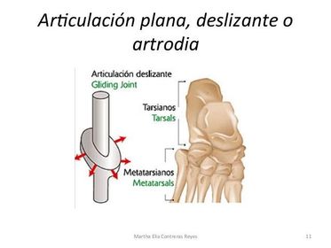 ARTRODIA Articulación de superficies articulares planas, que solo permite ligeros desplazamientos de un hueso sobre el otro. |
