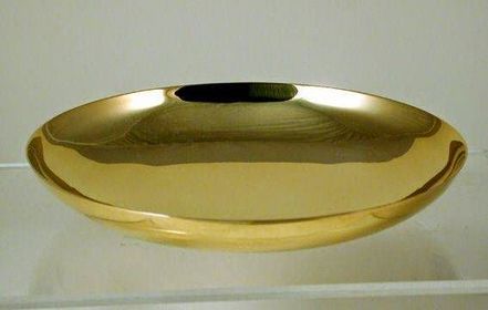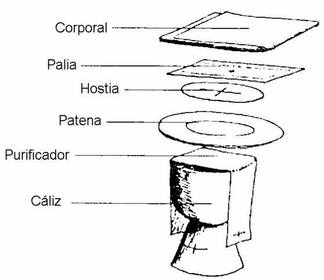 | Patena: Plato redondo donde se pone la Sagrada Forma. Debe ser consagrado exclusiva y definitivamente para el uso en la Santa Misa. | |
