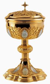 | Copón: Vaso con tapa en que se conservan las Sagradas Formas, para poder llevarlas a los enfermos y emplearla en las ceremonias de culto. | |