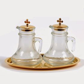 | Vinajeras: Las vasijas para el vino y el agua que se usan en la Santa Misa. Generalmente son de cristal y se colocan en una bandeja pequeña. Es permitido que sean de otro material (bronce, plata, oro e incluso de cerámica bien sellada) siempre y cuando puedan dignamente contener los líquidos | |