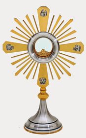 | Custodia: Recipiente sagrado donde se pone la Eucaristía de manera que se pueda ver para la adoración. También se le llama ostensorium, del latín ostendere, mostrar. Generalmente alrededor de la Eucaristía se representan rayos que simbolizan las gracias conferidas a los que adoran. | |