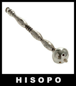 | Hisopo: Utensilio con que se esparce el agua bendita, consistente en un mango que lleva en su extremo un manojo de cerdas o una bola metálica hueca y agujereada para sostener el agua. | |
