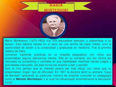 MARÍA MONTESSORI (1870-1952) Pensaba que el niño no podía llevar una vida normal en un mundo de adultos, por lo que la llevo a diseñar una gran cantidad de material didáctico (cubos, prismas, cajas, etc.) También enseñaba que era importante realizar ejercicios prácticos en torno a ciertos centros de interés de la vida cotidiana, desarrollando ejercicios psicomotores para ello. Para los números y la arimética empleaba monedas, palillos, etc.; y material de precisión que encajaba perfectamente. En resumen, Montessori pensaba que los niños tenían una mente absorbente que les permitía aprender del ambiente casi por naturaleza; sólo habría que brindarles el material apropiado a su edad y nivel de desarrollo.