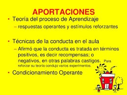 BURRHUS F. SKINNER (1904-1990) El aporte de Skinner fue transformar el simple condicionamiento en un condicionamiento operante de tal forma que puede llegar a explicar el aprendizaje y a utilizarlo para potenciar aprendizajes específicos que la escuela, o cualquier otra institución educacional, desee. Skinner propone que la conducta es una respuesta a estímulos externos y que, a través de estos, se puede lograr un cambio en ella. A partir de esto, se puede apreciar el aporte concreto de Skinner: transferir estas situaciones de laboratorio a la educación, dándole importancia a los factores ambientales y creando un espacio que conduzca a un comportamiento intencional, lo que se refleja, por ejemplo, en la enseñanza programada.