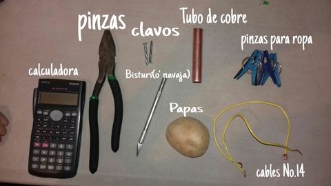 | Los materiales que utilizaremos son: 1 Calculadora Pinzas 2 Clavos 1 Bisturí ó instrumento punzocortante 2 Papas 1 Tubo de cobre 4 Pinzas para la ropa 30 cm de cable de cobre calibre 14 | |