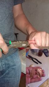 | Con ayuda de las pinzas, haremos dos laminitas con dos cortes en las esquinas ( para poder meterlos en las papas). | |