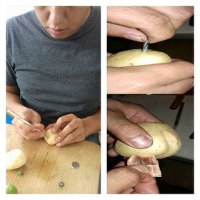 | Ahora con el bisturí o una navaja aremos dos incisiones a las papas (estas deben de estar una en cada extremo). Posteriormente metemos un clavo y una laminita a cada papa donde hicimos las incisiones. | |