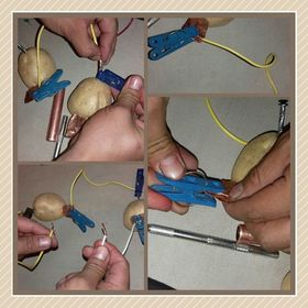 | Cortamos el cable de cobre en tres partes iguales y pelamos las puntas, después conectamos un extremo del cable a la lamina de una papa y el otro extremo en el clavo de la otra papa y los sujetamos con ayuda de las pinzas para ropa quedando una conexión en serie, conectamos una de las puntas los otros dos cables a cada una de las papas( una del clavo y la otra de la lamina) quedando los otros extremos libres. ¡Listo tenemos nuestra pila! | |