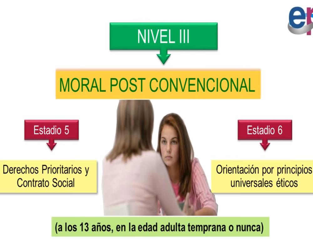 Estadio 5: Preservar el orden social es una prioridad secundaria, " lo que importa no es lo que dicen las normas si no juzgar, situándose en un punto de vista de bien común. Estadio 6: Prevalece el punto de vista en donde el cual el único modo de tener justicia es seguir tratando a cada uno imparcialmente. |