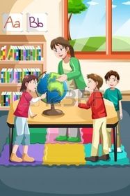 Ils sont en classe de Géographie.Ils étudient la leçon avec leur maîtresse. | |