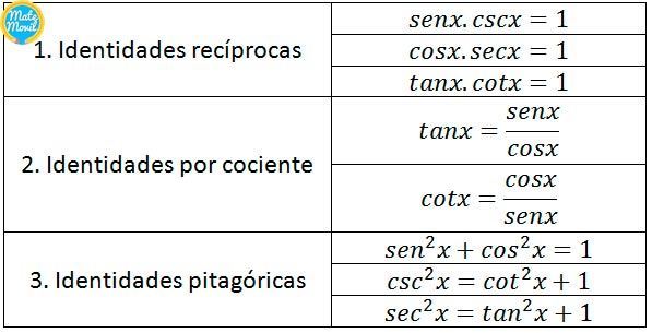 | Cual es la identidad trigonométrica en función de seno y coseno | sen ^2+ cos ^2=1 |