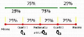 Los cuartiles dividen en cuatro partes las observaciones, el primer cuartil ( Q_1) es un valor que deja por debajo de el al 25% y por encima el 75% de las observaciones. El cuartil 2( Q_2) es la mediana. El cuartil 3 (Q_3) deja por debajo el 75% y por arriba el 25% de las observaciones.