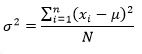 Medidas de dispersión Varianza poblacional. | Cuando la población es finita y está formada por N valores la varianza poblacional puede dfinirse como: |