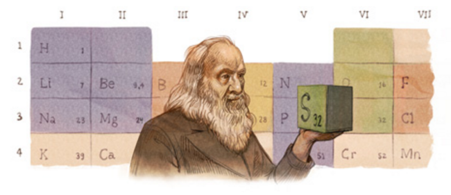 | Dimitri Mendeleyev, en 1869, publicó su primera tabla periódica, que contenía 63 elementos. Junto con Lothar Meyer llevaron a cabo la clasificación de acuerdo con los siguientes criterios: | - Colocaron los elementos por orden creciente de sus masas atómicas. - Situaron en el mismo grupo elementos que tenían propiedades comunes como la valencia. |
