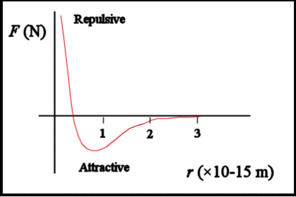 | What is the range of repulsion of the strong nuclear force? | The strong nuclear force becomes repulsive when nucleons are separated by less than 0.5 fm. |