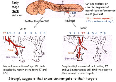 | Describe an experimental approach that shows us that motor axons are guided specifically to their targets in the chick embryo | |