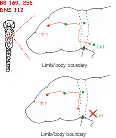 | Describe evidence from the grasshopper embryo limb that pioneer axons also follow stereotyped paths | The pioneer Ti1 (tibial1) growth cone makes a specific turn at the limb boundary, and then again as it approaches a specific cell, Cx1. Ablation of Cx1 causes the Ti1 growth cone to stall at the other side of the limb boundary. Neither Cx1 nor the limb boundary cells are distinguished by any obvious morphological features - there must be molecular differences in the enviroment. |