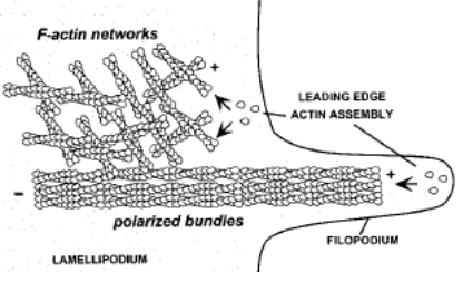 | How are the actin bundles arranged in filopodia? | The actin bundles are polarised to form larger bundles. |