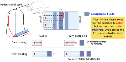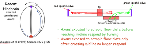 | What evidence is there that axons reprogram when intermediate targets (choice points) are encountered? | Commissural axons also become sensitive to repellants after crossing floor plate |