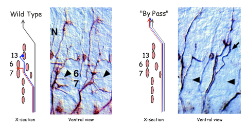 | How do we know that Fas II adhesion also controls defasciculation? | Overexpression of Fas II leads to a “By Pass” phenotype where the red and blue motor axons fail to defasciculate and so miss their targets (muscles 6, 7 and 13) |