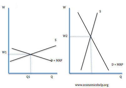 | Skilled and Unskilled workers | Skilled workers receive higher wages than unskilled workers because the demand is higher and supply is lower. MRP of skilled labour is high because their skills generate high output per worker and it is more difficult to be replaced with capital |