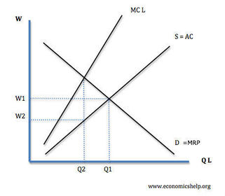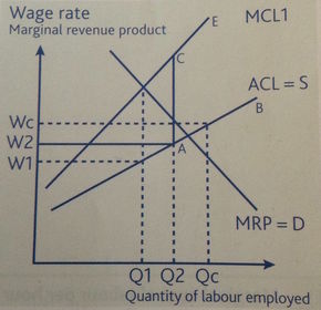 | Employers with labour market power | Firms who can employ a high percentage of workers in the labour market can influence the wage rate. A monopsonist is a price maker and they dictate the wage rate. In order to increase labour supply they have to increase the wage rate, MC>AC of labour |