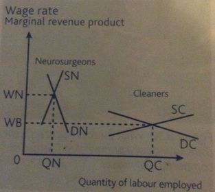 | Government policy | Introduction of the NMW had a positive impact on the pay of cleaners. Similarly an increase on healthcare spending has lead to increasing demand for surgeons due to the large ageing population in the UK. This increases the MRP of surgeons |