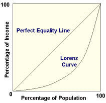 | Lorenz Curve (a / a+b) | This diagram shows that if there was perfect equality then 50% of income would be earned by 50% of the population The Lorenz curve shows how income/wealth are distributed. E.g. 10% of income to 20% of the population |