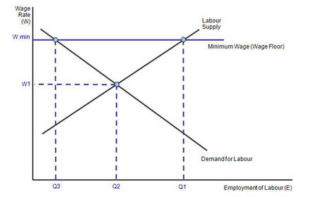 | Setting a NMW of Wmin could mean that firms costs will rise and therefore create unemployment of Q2Q3. This could be seen as an example of government failure. The extent of the unemployment created depends in the elasticities of demand and supply | |
