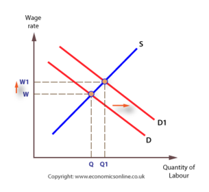 | If MRP increases the demand for labour will shift to the right D1-D2. This could be as a result of an increase in training schemes or demand for the goods produced rising. | |