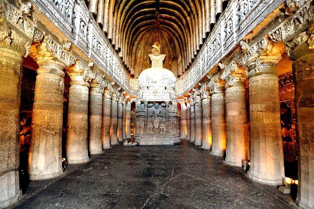 | 30 rock-cut monuments that include paintings and sculptures considered to be masterpieces of Buddhist religious art | Ajanta Caves |