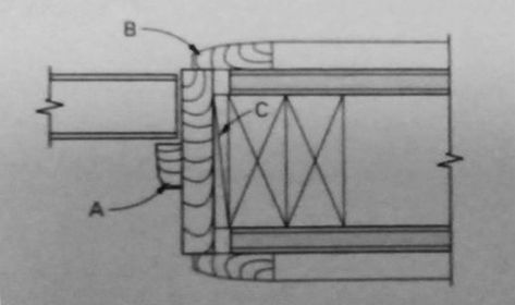 49. This illustration shows a section of a standard wood doorframe in a wood stud partition, including the stop (component A), the casing trim (component B), and the shim (component C). |