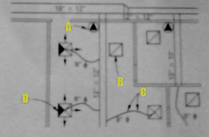 160. On an HVAC plan, These are the symbols for (A) fire damper (B) return air diffuser (C) round flexible duct (with the size given) (D) supply air diffuser with one quadrant blocked off and air directed as shown by the arrows |